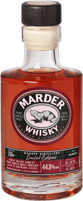 Alle Informationen zu Marder Single Malt Whisky Amarone Destilliert aus einem aromatischen Gerstenmalz mit einem kleinen Anteil Röstmalz.Die Reifung im Amarone-Fass verleiht dem Whisky eine besonders dunkle Farbe. Im Geruch finden sich harmonische Noten von dunklen Früchten, Rosinen, Backpflaumen. Am Gaumen präsentiert sich dieser Whisky ausgesprochen rund, komplex mit einem weichen Mundgefühl. Im Nachklang lang anhaltend mit würzigen Noten von Tabak und dunkler Schokolade.Unser Marder Single Malt Whisky wird nicht gefärbt und nicht filtriert.