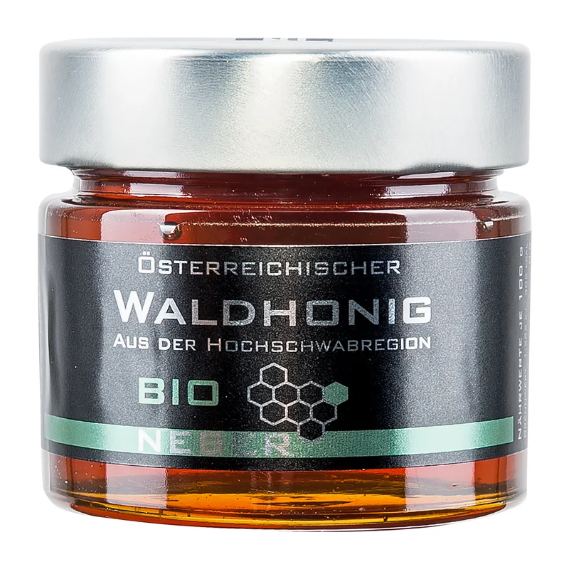 Anton Neber | Bio Waldhonig | 250g Der BIO Waldhonig von Neber Honig aus Österreich ist ein kräftiger, dunkler Honig mit tollem Aroma. Dieser bernstein farbende über rötlich braune bis schwarze Honig ist ein Honig aus Honigtau und stammt größtenteils von der Rottanne (Fichte). Weitere Geschmacksbestandteile sind z.B. die Waldhimbeere und der Bergahorn. Dieser Honig aus Österreich zeichnet sich durch seine natürliche Vielfalt von Wirkstoffen, vor allem mit seinem Mineralstoff- und Enzymgehalt, aus und bleibt durch seinen hohen Fruchtzuckeranteil lange flüssig, kristallisiert aber dennoch aus. Die Ernteregionen dieses Honigs aus Österreich sind die Hochschwabregion und die Fischbacher-Alpenregion in der Steiermark. Honig aus Österreich | 100% naturrein Oberstes Ziel bei der Honiggewinnung ist es, hochwertige, sortenreine Honige, sogenannte Trachtenhonige zu ernten. Dazu bedarf viel Erfahrung im Umgang mit den Bienen aber auch in Bezug auf das Reifen der Honige, denn nur reifer Honig ist lagerfähig und beginnt bei richtiger Lagerung nicht an zu gären. Jeder Honig ist in Geschmack, Farbgebung und Fließeigenschaft einzigartig und ist ein Abbild der Region in der die Bienen den Nektar sammeln. Die Bio Imkerei Neber bietet steirischen Honig aus Österreich in vielen schmackhaften Sorten wie Akazien-, Sonnenblumen-, Kastanien-, Löwenzahn-, Wald-, Waldblüten- oder Lindenblütenhonig an. Wie keine anderer jedoch versteht sich die Imkerei Neber auf die Veredelung des Honigs. Sie führt ein ungewöhnlich breites Spektrum von verfeinerten Honigen wie z.B. mit Bourbon Vanille, mit Blattgold oder mit gehackten Kürbiskernen oder aber mit Waldbeeren oder Kornelkirschen. Auch hier achtet Anton Neber auf beste Zutaten aus der Region. Natürlich ist sein Honig aus Österreich biozertifiziert. Bio Kontrollstelle AT-BIO-301 | Österreichische Landwirtschaft