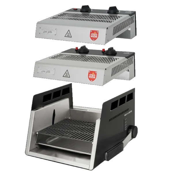 Otto Wilde Grill | OFB Original Gas + Elektro Warum einen Otto Wilde Grill OFB Original von Otto Wilde Grillers? Das Geheimnis hinter einem guten Steak ist die richtige Temperatur. Nach 3 Minuten Vorheizen erreicht der Otto Wilde OFB Original Temperaturen von über 900°C. Durch das im Set enthaltene Elektro-Top lässt sich der Grill sowohl Outdoor als auch Indoor verwenden. Oberhitzegrill | für das perfekte Steak OFB steht für Over-Fired Broiler, weil die Hitze von oben kommt. Das Herz sind dabei zwei Infrarot-Gasbrenner, die ihre Wärme von über 900°C nach unten abstrahlen. So bekommt das Steak eine schöne gleichmäßige Kruste – anders als bei der klassischen Unterhitze, wo herabtropfende Fleischsäfte und Fette die Hitzeverteilung stören. Dank der innovativen Oberhitze-Technologie dauert die Zubereitung eines Steaks inklusive Vorheizen nur wenige Minuten. Beide Brenner lassen sich individuell und stufenlos regeln und machen den O.F.B. zu einem extrem vielseitig einsetzbaren Grill: Neben Steaks eignet sich der O.F.B. daher auch perfekt für Gemüse, Fisch oder sogar Pizza. OFB Original Komplettset Der Otto Wilde Grill OFB Original Oberhitzegrill ist für die Verwendung im Außenbereich bestimmt und kann auf einen herkömmlichen Garten- oder Grilltisch gestellt werden. Durch den herausziehbaren Hitzeschild wird die Tischoberfläche vor der Wärme geschützt. Der Otto Wilde Grill wird mit einer herkömmlichen im Baumarkt erhältlichen Propangasflasche betrieben. Im Komplettset ist außerdem das OFP Elektro-Top enthalten. Damit lässt sich der Oberhitzegrill ruck-zuck in einen waschechten Elektrogrill mit Indoor Eignung verwandeln. Somit bleiben Sie flexibel, je nach Lust und Laune.Lieferumfang des OFB Original Komplettset: OFB Grill mit 2 Keramikstrahler und verschweißtem Innenraum mit einer Temperatur von bis zu 900°C OFB Elektro-Top 230V für geniales Steakhaus Indoor Grillen Gasschlauch mit Druckminderer, damit kannst Du direkt loslegen Fettfangschale aus Edelstahl, mitfahrend für mehr Komfort Grillrost aus Gusseisen, Maße 32,5cm × 26,5cm – genug Platz für jeden gängigen Cut Multifunktionshebel für die Höhenverstellung und Grillrostbedienung, außerdem als kleines Gimmick auch als Flaschenöffner verwendbar Für das herausragende Produktdesign wurde der Otto Wilde Grill mit dem German Design Award ausgezeichnet. Kaufen Sie Ihren Otto Wilde Grill beim autorisierten Fachhändler – Otto Wilde Grillers Gold Händler – zum günstigen Preis!