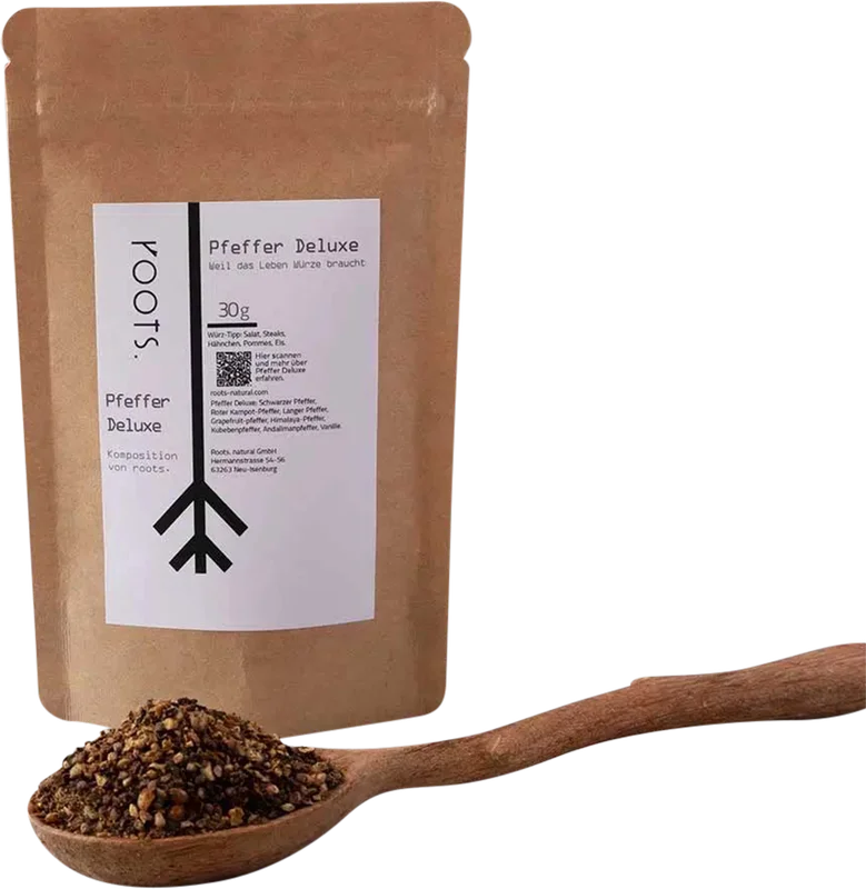 Alle Informationen zu Pfeffer Deluxe Mischung Nachfüllpack In dieser Pfeffermischung sind feinste Pfeffer der Gewürzmanufaktur roots. enthalten. Dabei wurden die verschiedenen Sorten akribisch aufeinander abgestimmt. Die exklusive Komposition passt zu Gemüse, Fisch, Fleisch oder in Salaten.Viele besondere Pfeffersorten sind im EinsatzEine gute Mischung ist ausgewogen und du solltest die einzelnen Pfeffersorten nicht herausschmecken. In unserer Komposition sorgt roter Kampot Pfeffer für eine besondere Schärfe, Anadaliman- und Grapefruitpfeffer sorgen für eine ausgeglichene Fruchtigkeit. Des Weiteren kommen noch andere Pfeffersorten zum Einsatz. Für ein ganz besonders tiefes Aroma haben wir unsere Pfeffer Deluxe Mischung mit Vanille abgerundet.