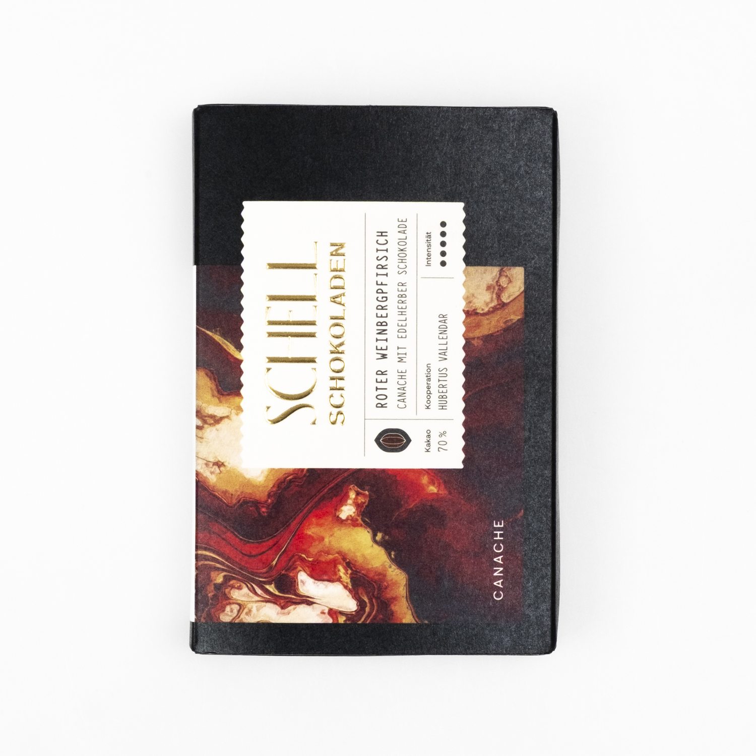 Chocolate praline with a ganache made from red vineyard peach liquor and fine fruit pieces