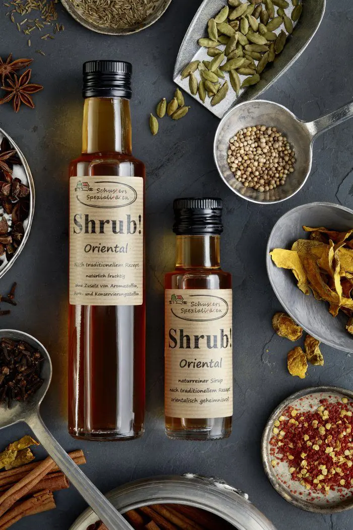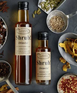 Shrub! Oriental besteht aus Gewürzen, wie zum Beispiel Zimt, Koriander, Kreuzkümmel und Cardamom, kombiniert mit Bio-Apfelessig und Zucker.