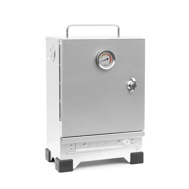 Thüros | S1 Tisch Räucherofen aus Edelstahl Der Thüros S1 Tisch Räucherofen ist der perfekte Räucherofen zum Warm oder Kalträuchern ohne viel Platz zu verbrauchen. Der Thüros S1 wird aus hochwertigem, antimagnetischen Edelstahl V2A / 4301 gefertigt und ist somit für viele Jahre einsatzbereit ohne zu rosten. Nicht nur der Korpus ist aus diesem hochwertigem Edelstahl gebaut, sondern auch die Rostauflagen und die Haken. Highlights | Thüros S1 Räucherschrank Temperaturen bis zu 80 Grad inklusive Thermometer Höhe x Breite x Tiefe – 45 cm x 30 cm x 19 cm Späneschale ist in der Grundausstattung bereits enthalten S1 Tisch Räucherofen | klein aber oho Der S1 von Thüros ist als kleiner mobiler Räucherofen äußerst beliebt. Ob unterwegs oder für die Hütte, er ist praktisch und mobil. Lieferumfang:Korpus, 2 Rostauflagen, Späneschale, Feuerlade, Thermometer